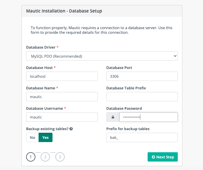 Akses http://example.com dan klik Next Step untuk memulai proses instalasi.