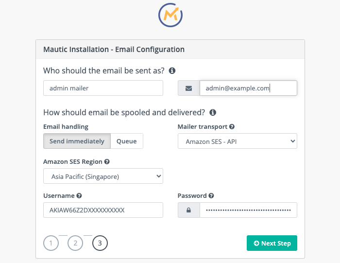 Bagian Email Configuration, pilih Mailer transport Amazon SES - API lalu tentukan region serta username dan password saat identity SES dibuat.