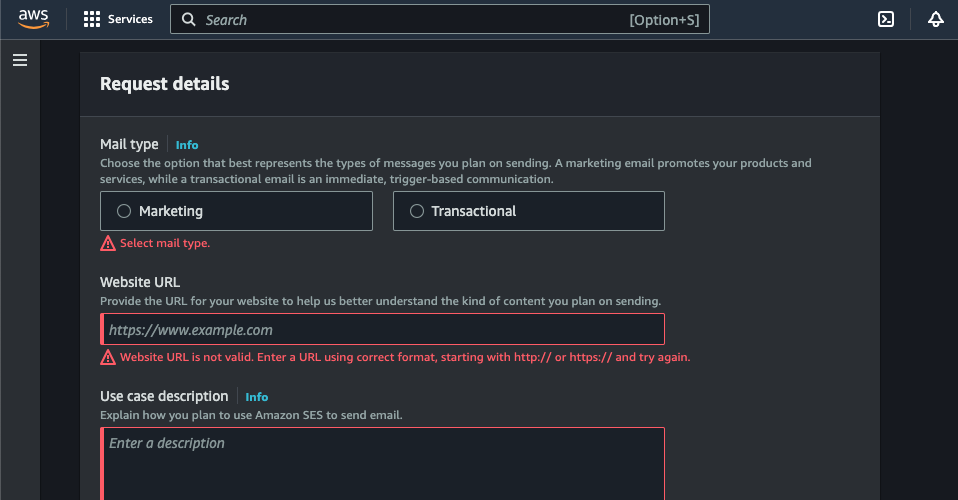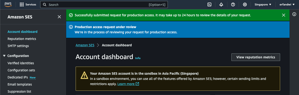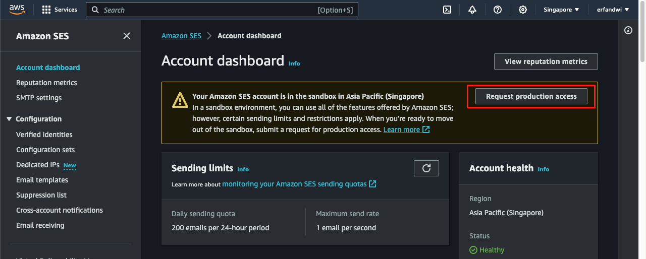 Kembali ke dashboard SES lalu klik Request production access agar dapat mengirimkan email ke alamat email yang belum diverifikasi atau tidak ditambahkan secara
