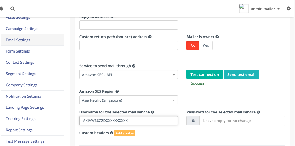 Untuk memastikan SMTP dengan Amazon SES - API berfungsi, lakukan test connection di Settings > Configuration > Email Settings atau http://example.com/s/config/edit