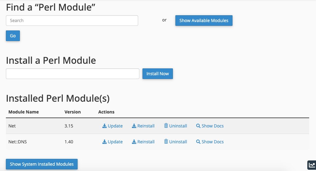 Dari menu ini Anda bisa install, update, reinstall, atau uninstall modul perl.