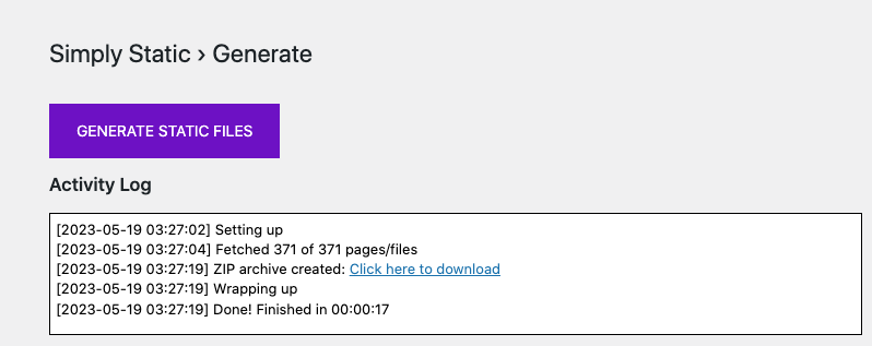 Generate melalui Simply Static › Generate. Lalu klik Generate Static Files