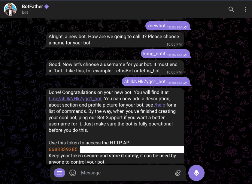 Buka Telegram, search BotFather lalu buat bot dengan perintah /newbot seperti berikut.