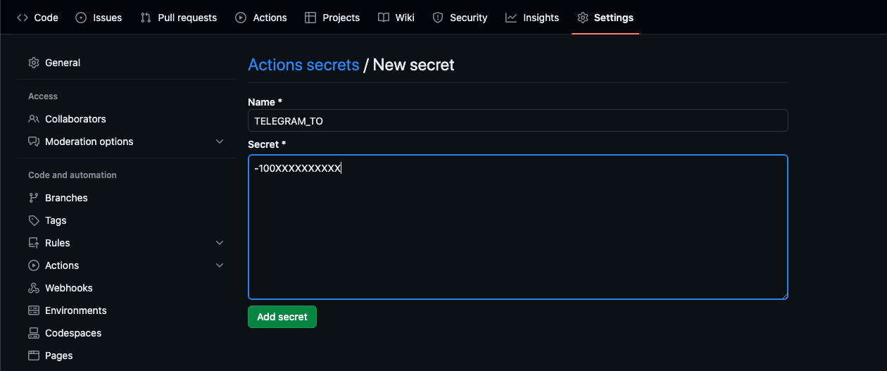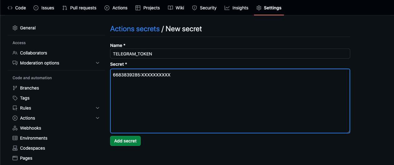 Klik New repository secret kemudian tambahkan Bot Token dan Chat ID.