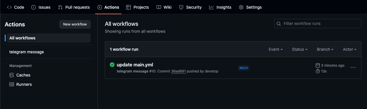 Akses menu Actions untuk melihat status workflows. Apabila berhasil maka Bot seharusnya akan mengirimkan pesan ke dalam grup.