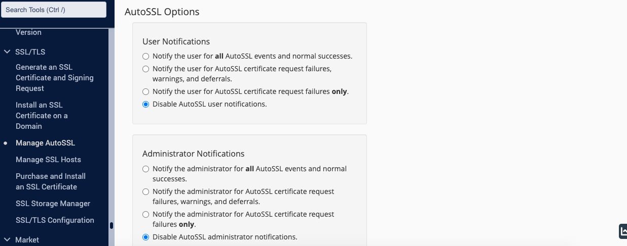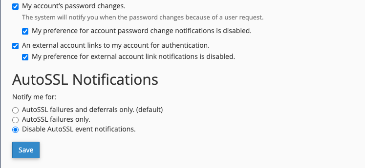 Selanjutnya pada AutoSSL Notifications, Pilih disable event
