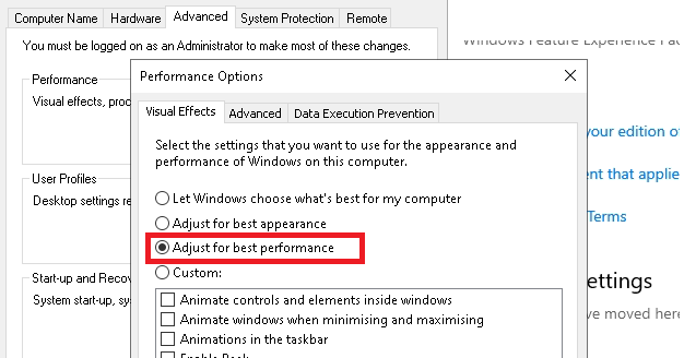 Pada bagian Performance klik Setting lalu pilih Adjust for best performance > Apply