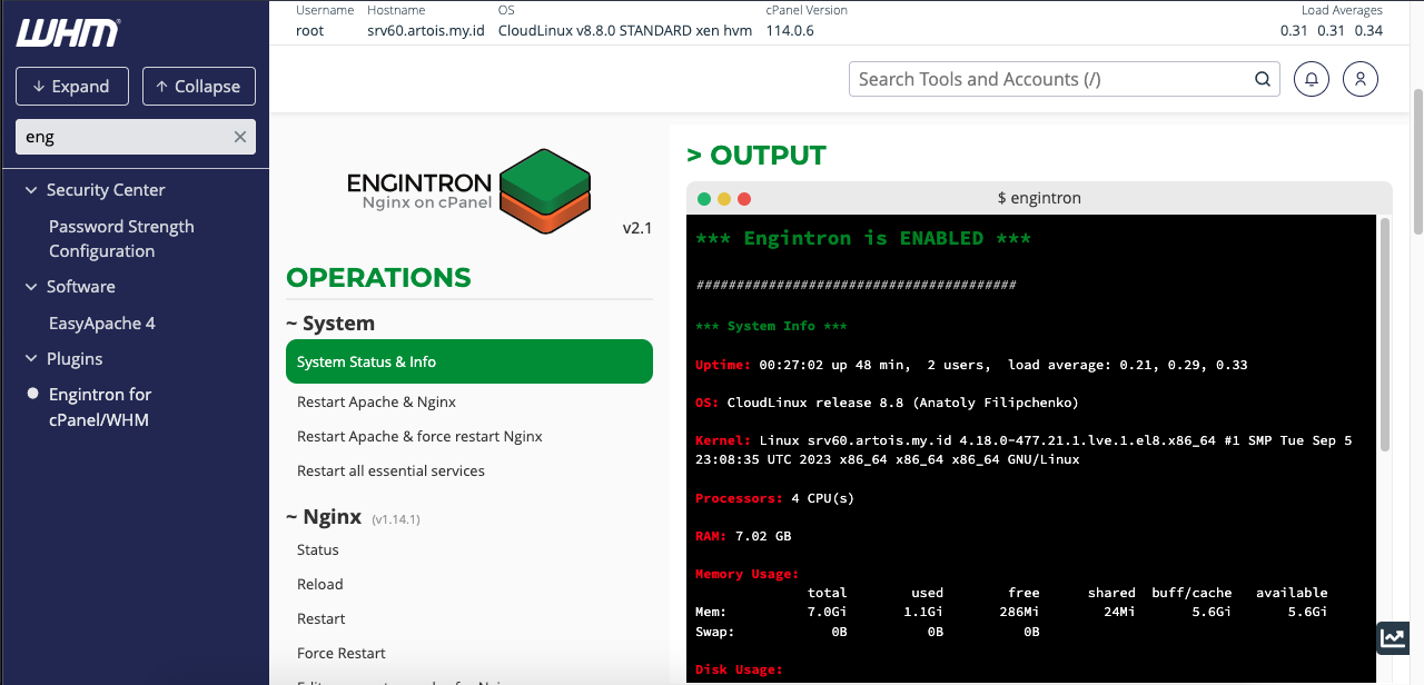 Jika instalasi berhasil, selanjutnya akses ke WHM lalu navigasikan ke Plugins > Engintron for cPanel/WHM