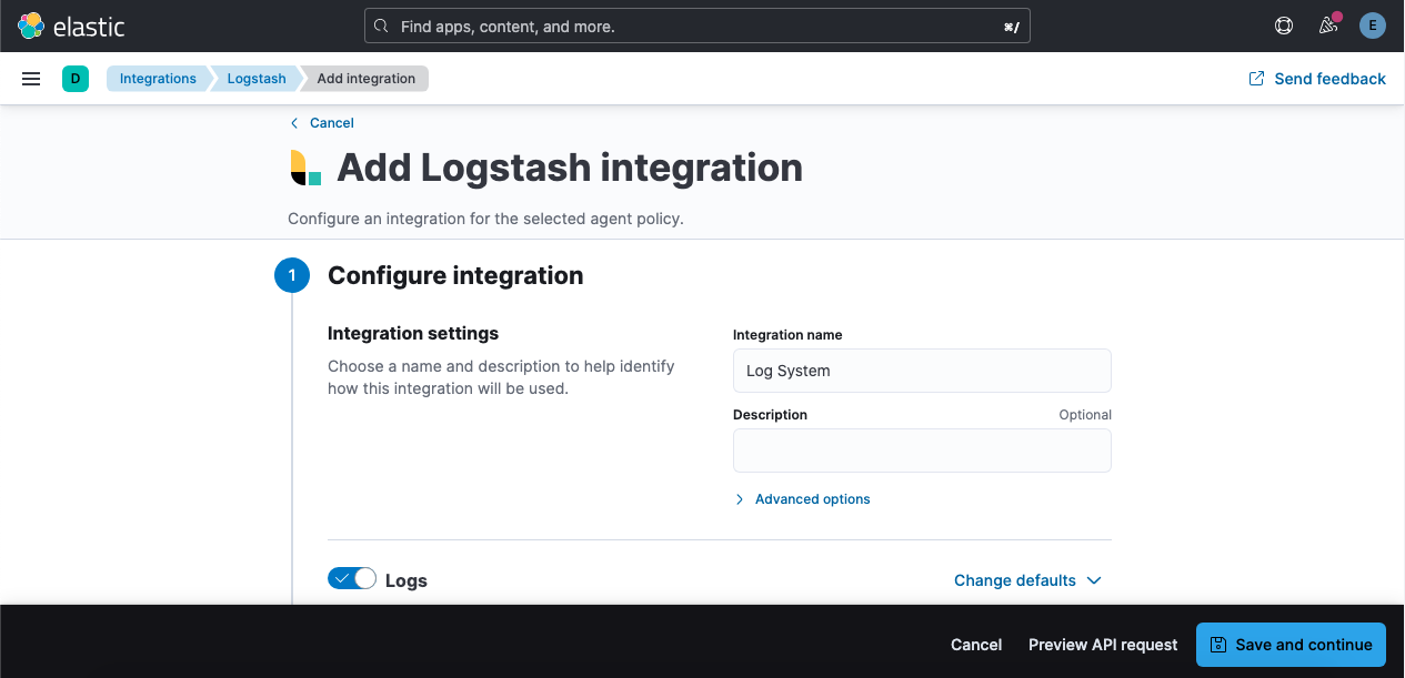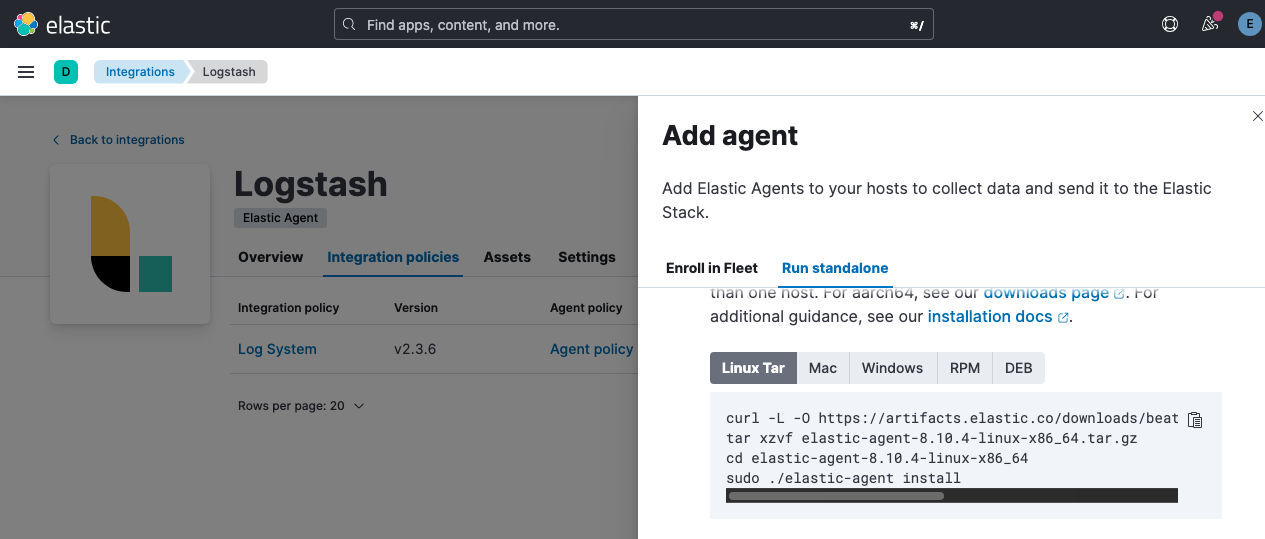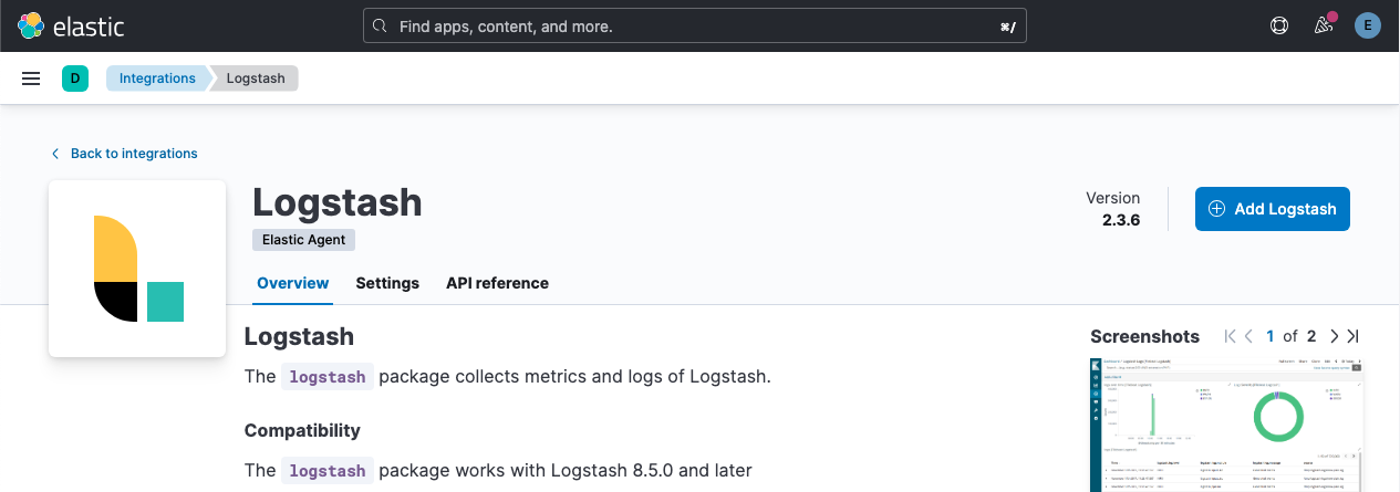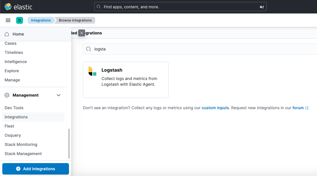 Dari dashboard kibana, klik Add integration lalu cari Logstash.