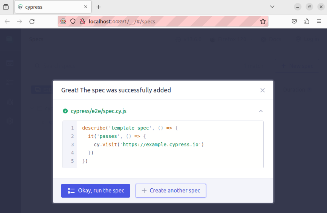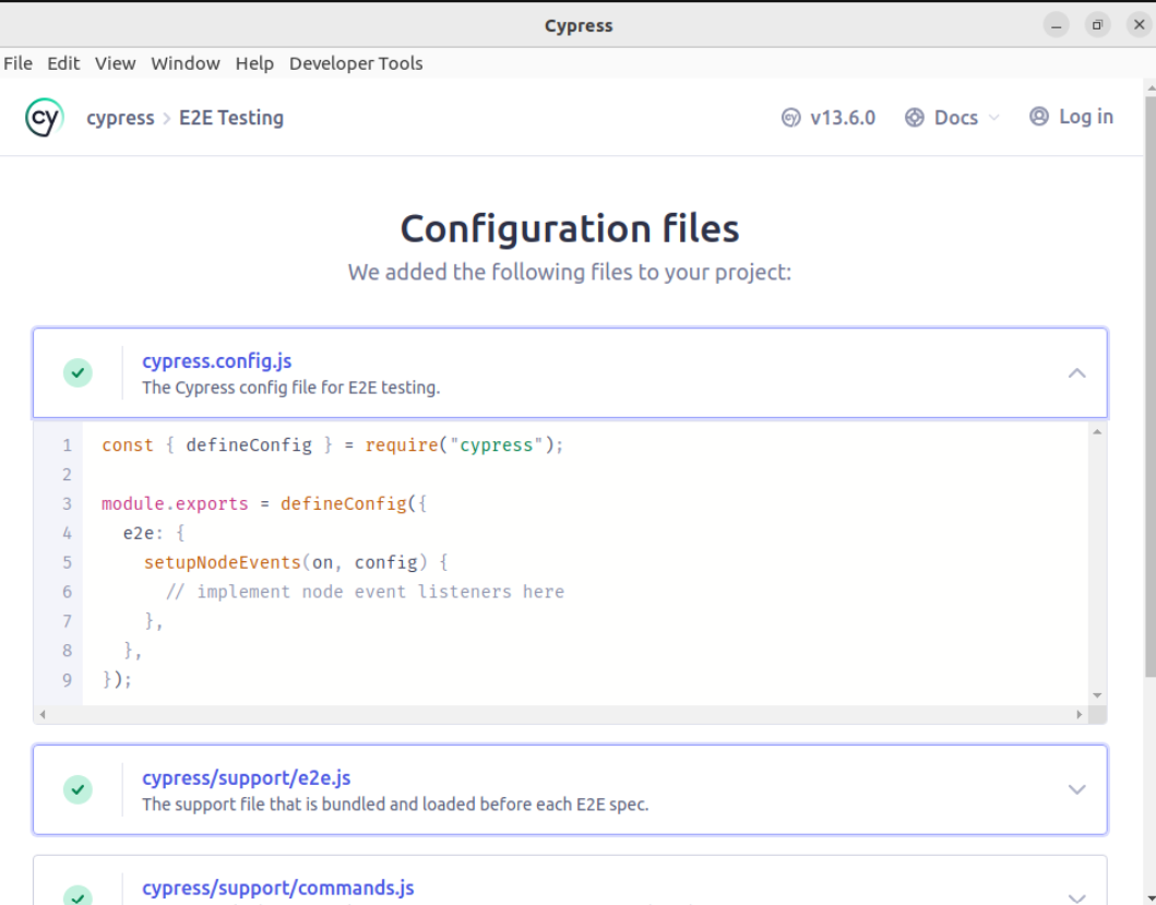 Setelah dipilih, konfigurasi untuk E2E Testing akan digenerate.