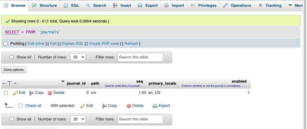 Masuk ke phpMyAdmin lalu pilih database yang digunakan untuk OJS dan pilih tabel journals