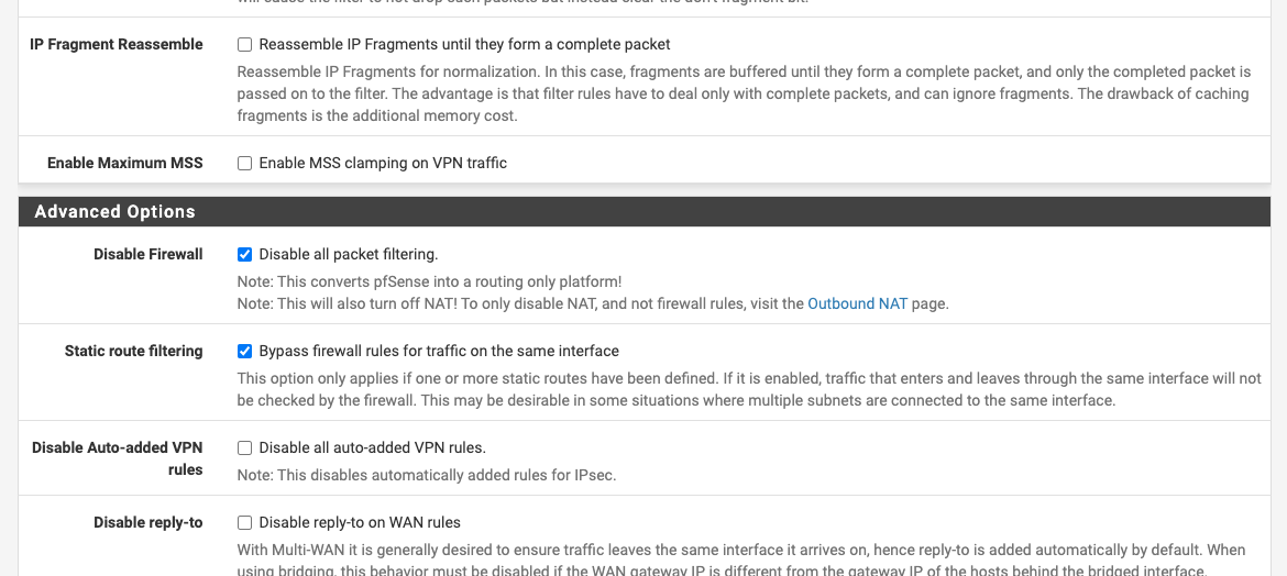 Scroll ke bawah sampai ke bagian Advanced Options lalu checklist Disable all packet filtering dan Bypass firewall rules for traffic on the same interface